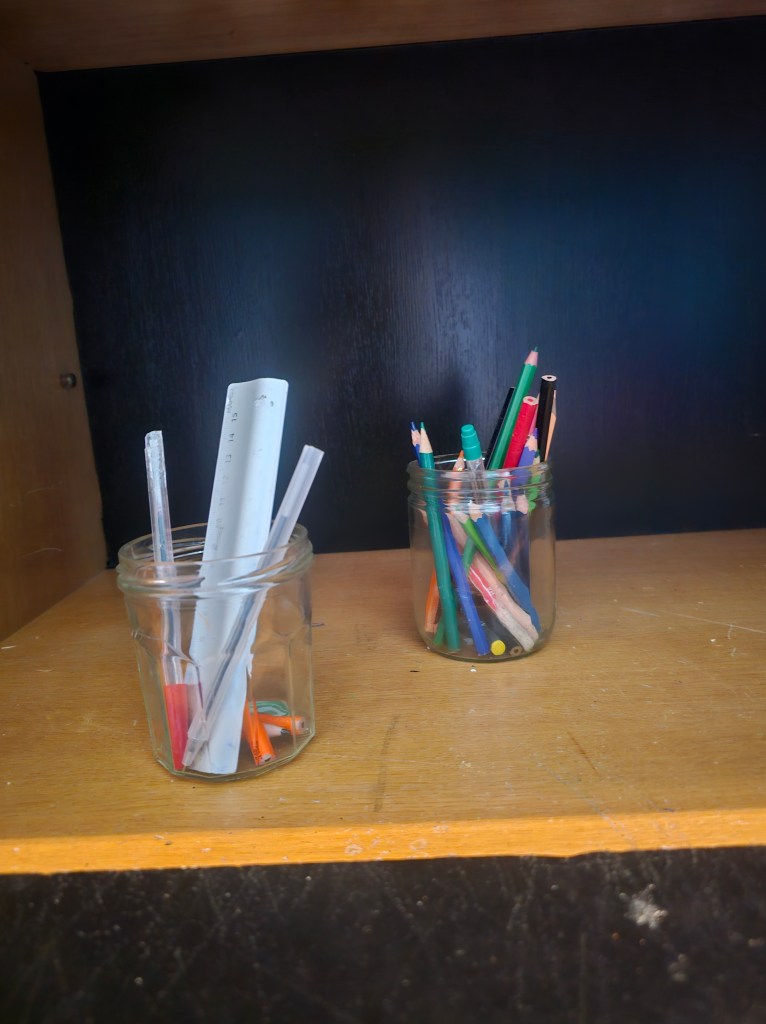 Un simple pot de confiture, une boîte en métal ou une jolie corbeille chinée feront parfaitement office de pot à crayons ou de vide-poche.