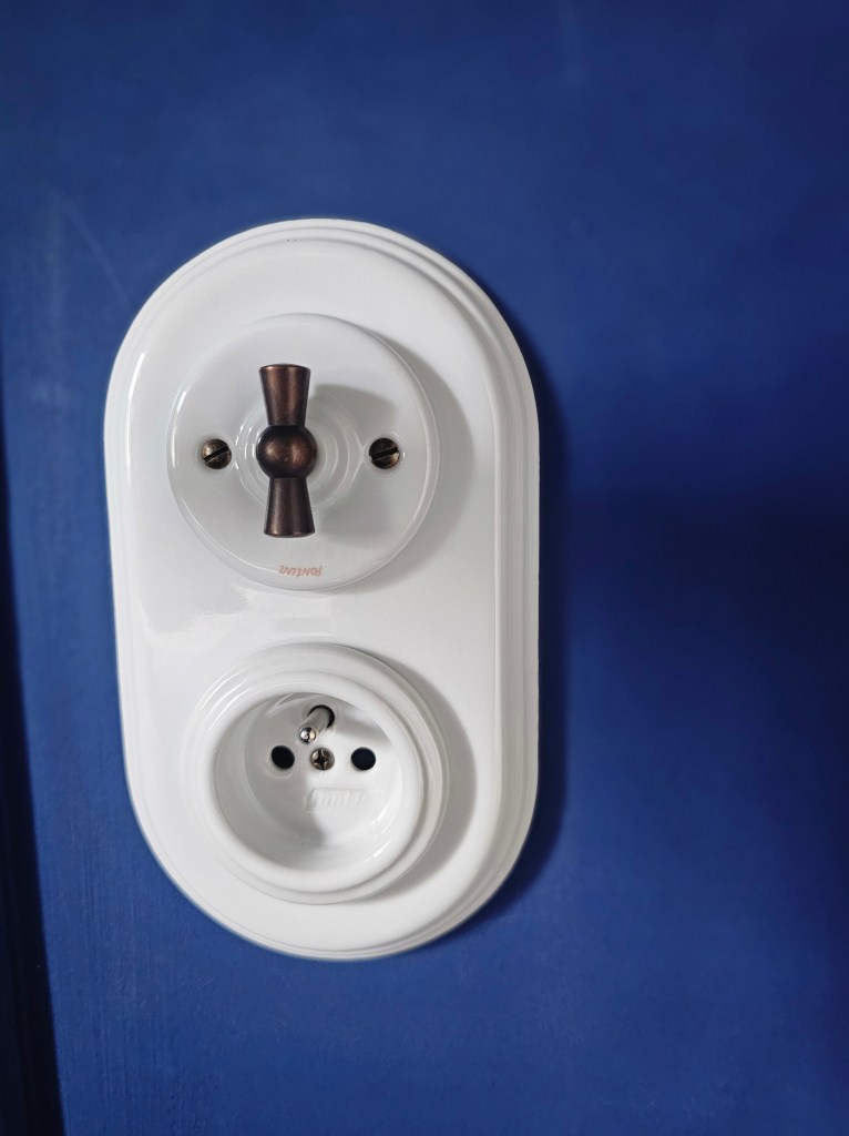 Un luminaire chiné et/ou upcyclé peut à lui seul changer l’ambiance d’une pièce. Associez-le à un élément plus haut de gamme (ici l’interrupteur) et le charme opère.