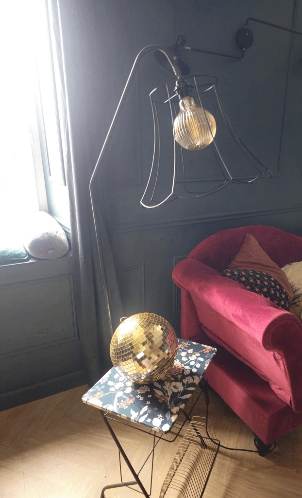 Son abat-jour d’origine ne racontait plus grand-chose. Alors je l’ai échangé avec un abat-jour qui traînait chez moi, sa structure vintage que j’adore, associé à un relooking peinture noire pour lui offrir un style à la fois authentique et actuel.